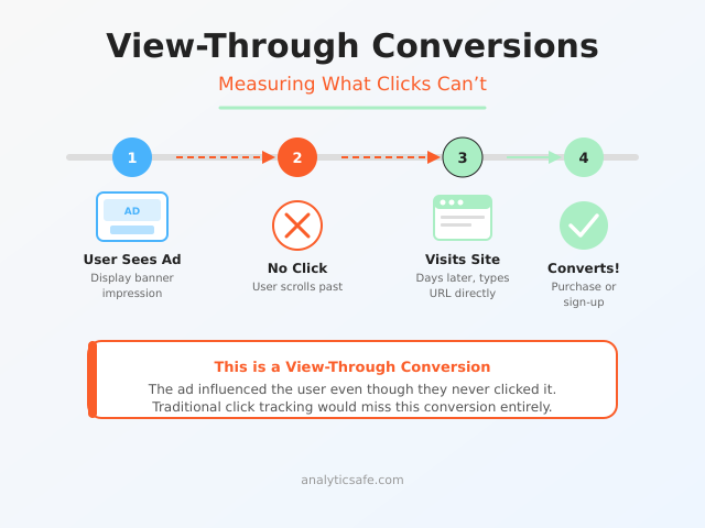 Think of it this way. You see a billboard for a new restaurant on your commute. You don’t stop immediately. Instead, you look it up that evening and make a reservation. The billboard influenced your decision. Similarly, view-through conversions capture the influence of digital impressions that don’t result in immediate clicks.